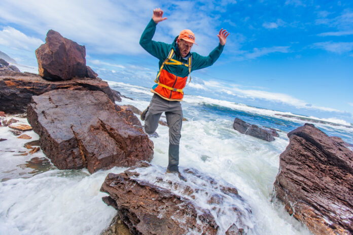 The trail meanders up and down along the rugged coastline.. Some miles are high on the Australian shelf, hundreds of feet above the sea, while others are right down on the beach with waves crashing practically underfoot. One of the spiciest times on trail came when we needed to cross a notorious passage while the tide was coming up. Finn and I were racing to get around a pinch point on the beach before high tide would make the passage too dangerous.