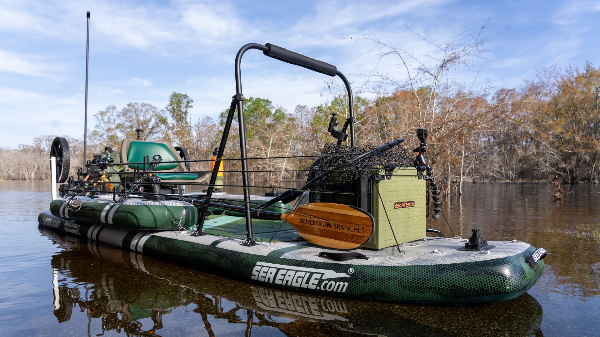 I started by outfitting the Sea Eagle FishSUP 1210 with a few essential pieces of gear. My paddle of choice? The Bending Branches Navigator, a solid performer when you’re paddling deep into places motors can’t reach. For landing fish, I rely on a YakAttack landing net, conveniently mounted thanks to the factory-installed gear mounts on the Sea Eagle.